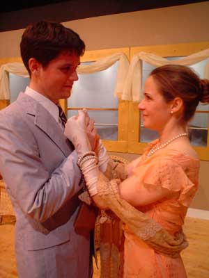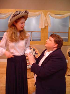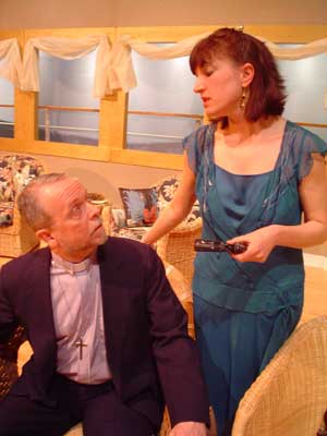 Mike: Both of the Mostyns were flashy because they were rich. Miss ffoliot ffoulkes was fancy because she was high class and she will let you know, repeatedly. All of her little accouterments were fancy, too. It was a complete package for all the characters. I really liked the set. It looked like a boat . They called it a casino or gathering place. You could look out the window and see a blue sky. It would have been nice if they could have rigged clouds moving by or seagulls flying through the air, or trees moving to show that the ship is moving. I don’t know how you would do that, but it’s just a thought. All in all this was a really good show.
