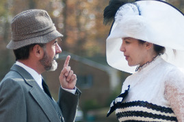The Ascot scene was well done, except that the onlookers all seemed to be looking at different places as the horses raced by. Perhaps a laser pointer or flashlight could be used to help the actors focus on the same spot while watching the race. During “With a Little Bit of Luck” the ladies were sitting in the background working on their flower arrangements, which unfortunately was a bit distracting as the men sang. Very creative touches were added to “Just You Wait.” As Eliza sang of what she wanted to do to Higgins, the lyrics were acted out by the ensemble in a very funny style.